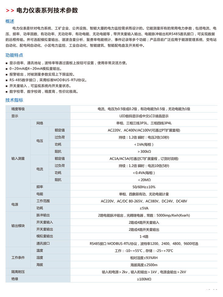 电力仪表是针对电力系统、工矿企业、公共设施、智能大厦的电力监控需求而设计的。它能测量所有的常用电力参数,包括电流、电压、频率、功率因数、有功功率、无功功率、有功电能、无功电能等,带开关量输入输出、电能脉冲输出和RS485通讯接口,可实现数据的远程传输。